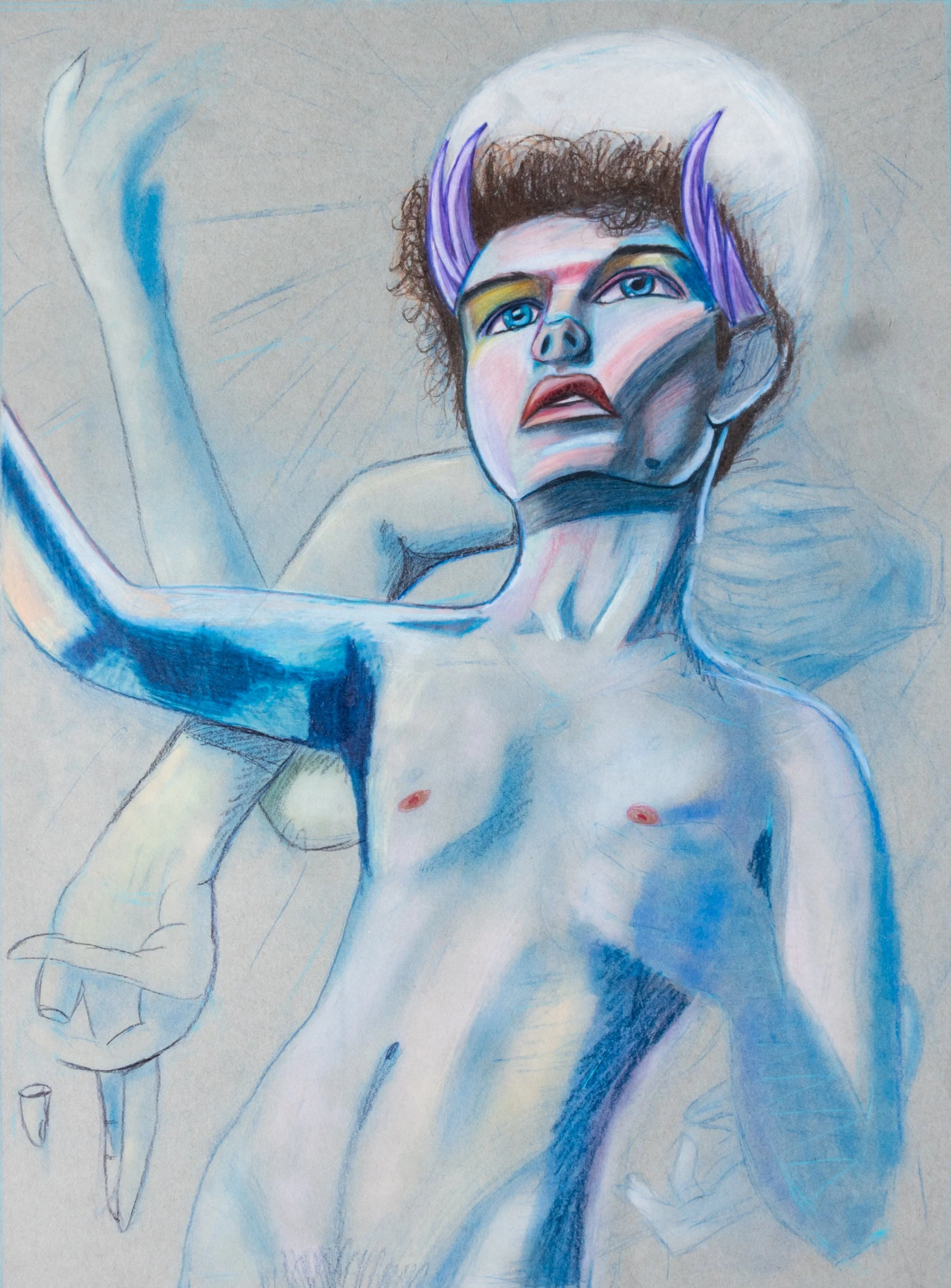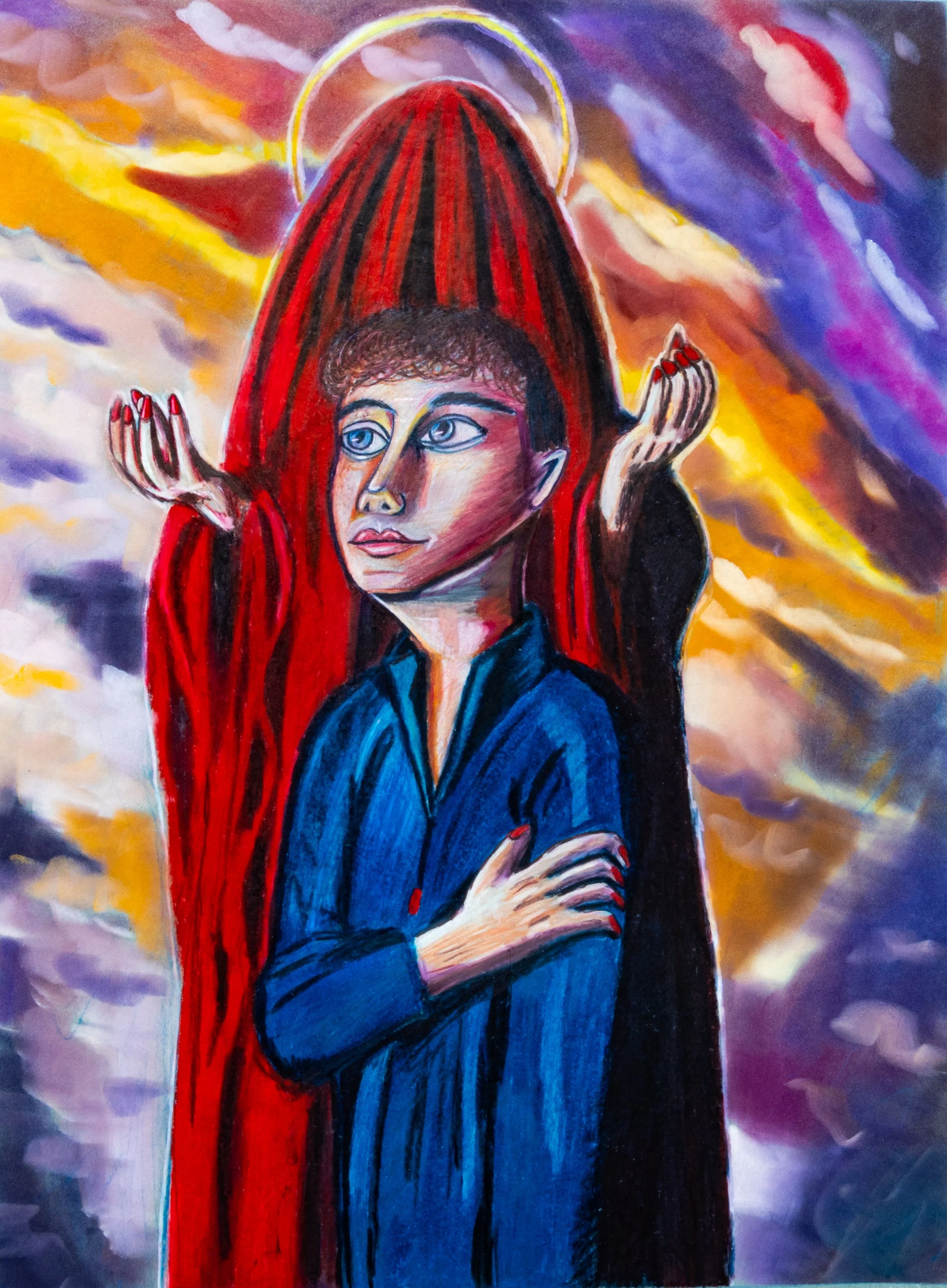 For my yearly self-portrait, I was incredibly manic and drew myself as a god with a purple diadem that I never finished and never will. I was diagnosed with bipolar shortly after creating the self-portrait, the medication that I was proscribed stamped on and crushed all my creativity, and drawing was immensely hard and I could barely draw a frog. I thought I lost it all, everything I worked so hard to accomplish, was gone. So I asked my professor for my final to do another self-portrait, and created something still having the religious iconography but with more meaning. I took an image of what I was envisioning, My bipolar behind me deified, as it deified itself, making me perceive myself as a god. I show my thumb and I am looking towards the future as the skies start a new as if morning light just broke through and I have a new day ahead of me. My nails are red and so is the figure, symbolizing our connection.